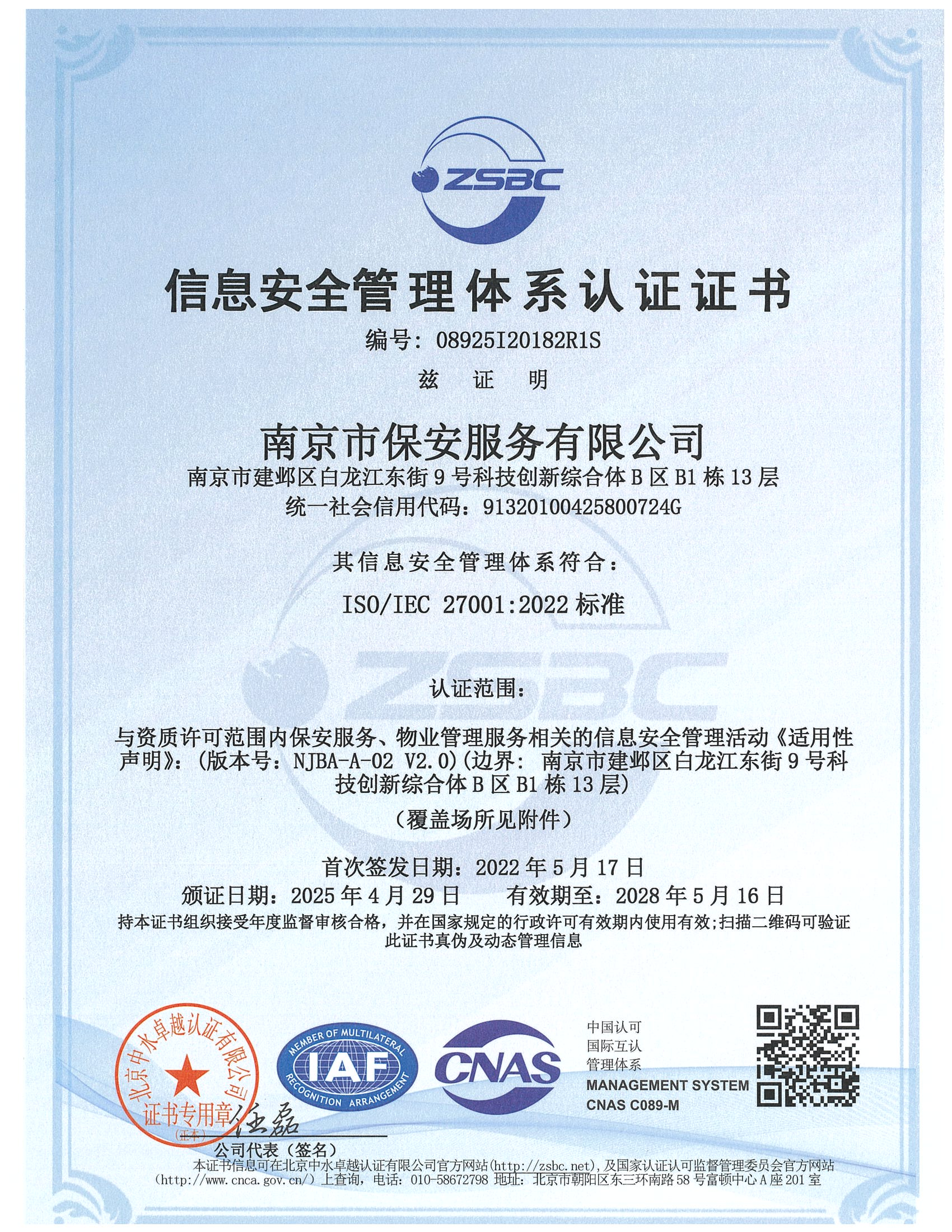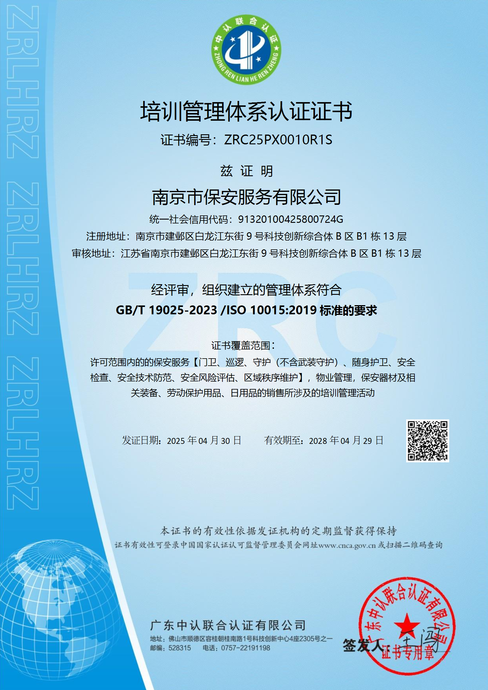 祝賀:南京市保安服務(wù)總公司通過企業(yè)誠信管理體系認證和企業(yè)社會責(zé)任管理體系認證
